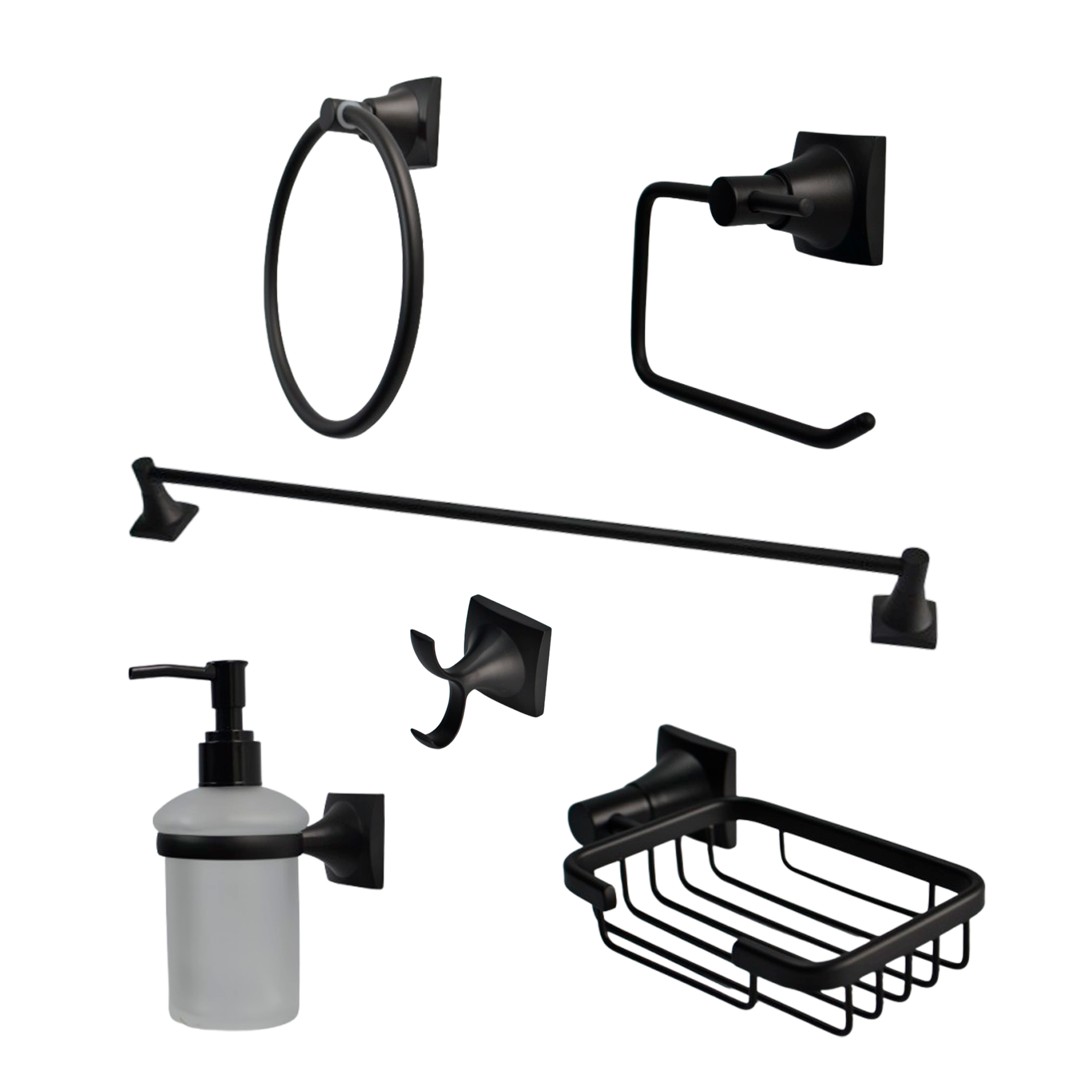 INCLUYE: PAPELERA, PERCHERO, TOALLERO REDONDO, DISPENSADOR DE JABON, JABONERA, TOALLERO LARGO